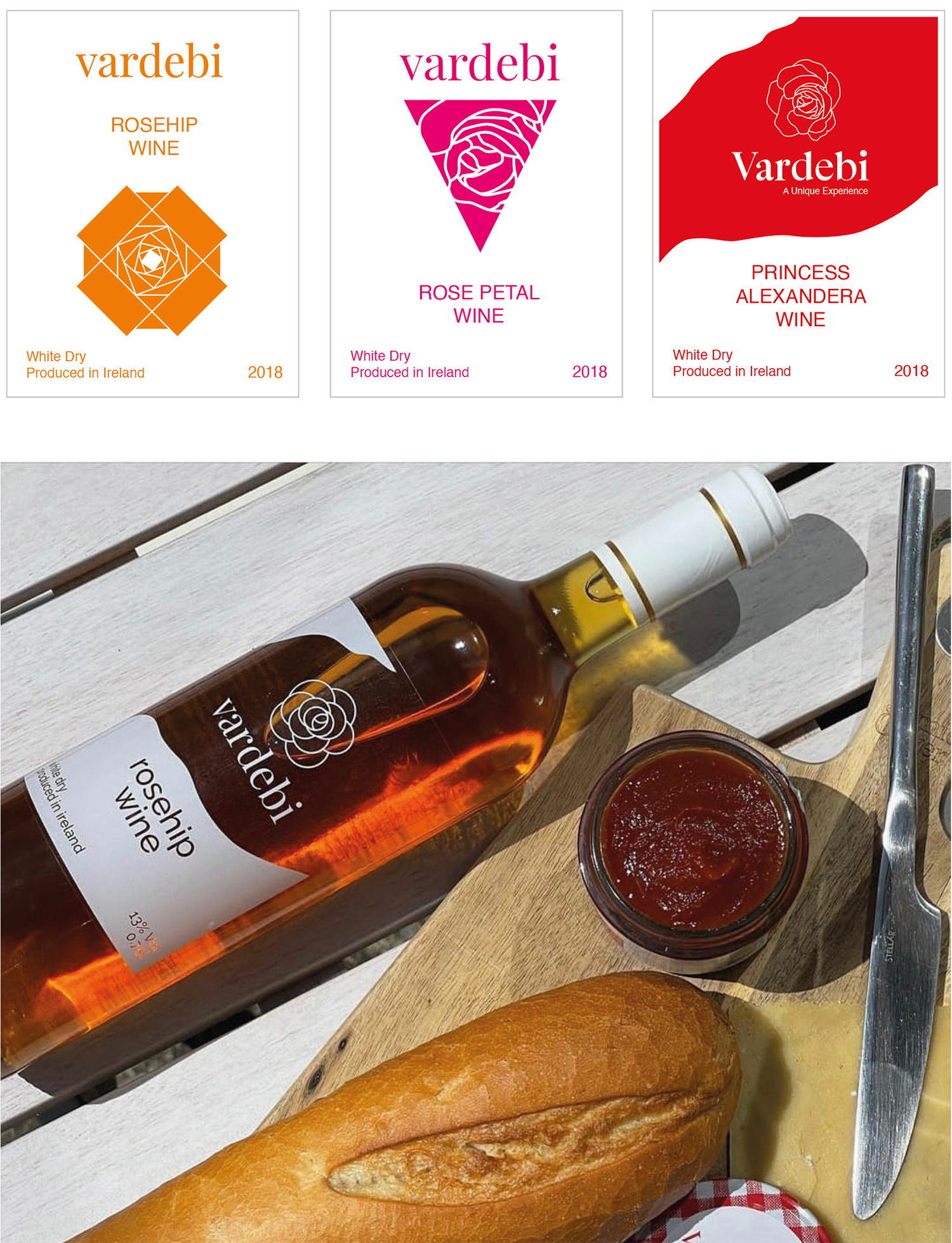 I was asked to create a logo for a new Irish made wine for Rolando from Vardebi wines along with the finished wine labels themselves. The wine itself is produced from homegrown roses and comes in a variety of flavours.